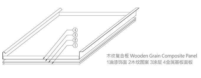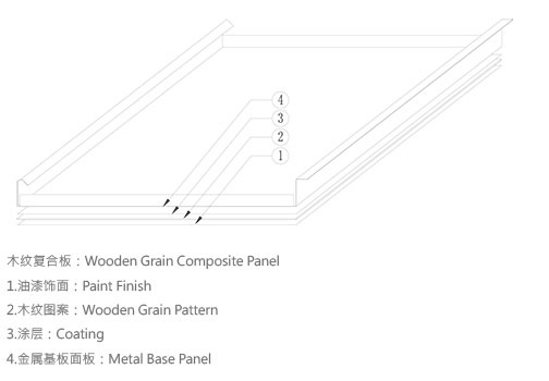 The products reach fire retardant requirement through the metal base material and wooden grain colors transfer printing, so it can be applied in more public areas and creates wooden natural decoration effect of harmony between human and nature.